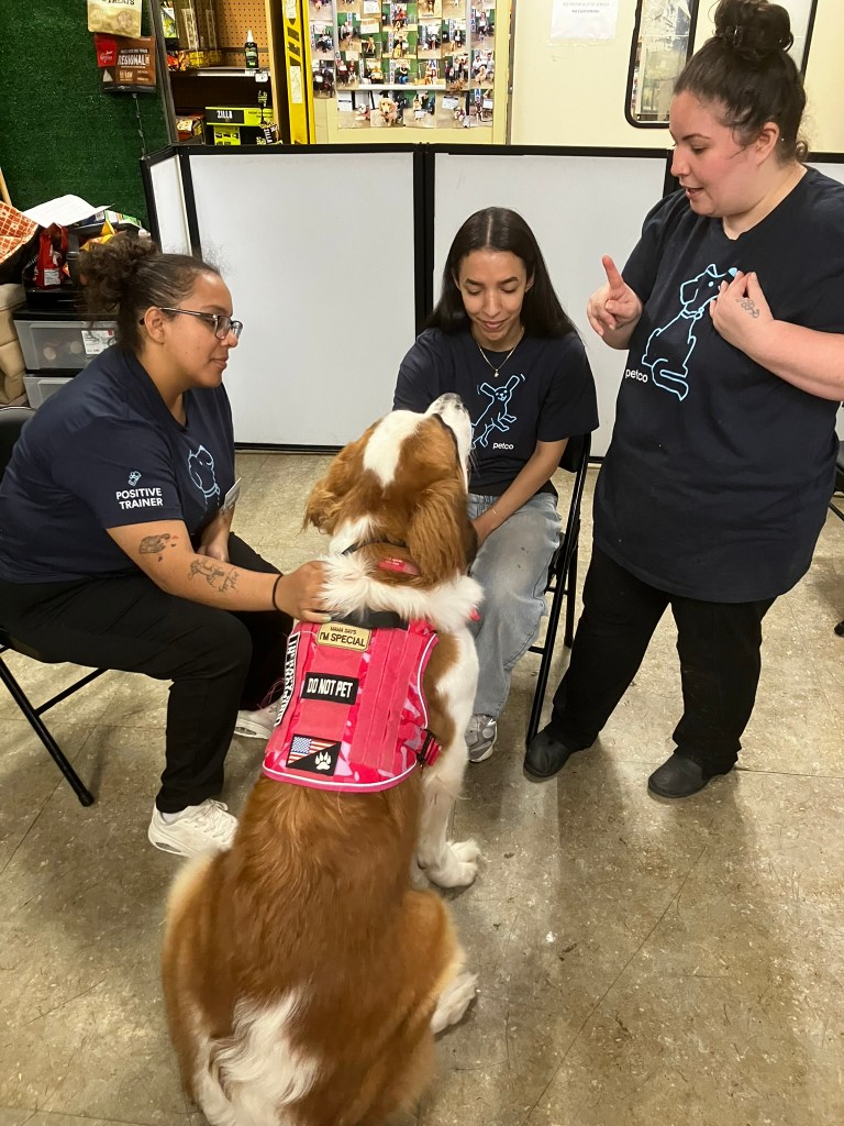 As Esther and I prepare to be evaluated as a registered Pet Partners therapy team, one of the most essential parts of her training is learning how to stay calm when many people are around her. In real visits, she won’t just meet one person at a time—there will often be family members, nurses, and staff gathered together, all eager to pet her and talk to her. With the help of her trainers and by guiding them through role play, I’ve been teaching Esther how to enjoy and feel safe in these situations.